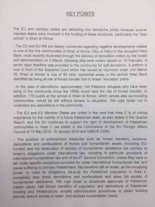 The above is the partial text of an EU Demarche issued in March by all 28 members states of the European Union, as delivered to the Israeli Foreign Ministry as a response to the Israeli military’s distribution of demolition orders on the entire village of Al Khan al Ahmar, as well as a petition for demolition of the car tyres school, filed by settlers from the illegal settlement neighbouring Al Khan al Ahmar: Kfar Adumim. It calls on the Israeli government, inter alia, to meet its obligations as occupying power vis-à-vis the Palestinian population in Area C, to completely stop demolitions and confiscations, and allow full access for humanitarian assistance. The EU also urged Israel to accelerate approvals of Palestinian master plans, to halt forced transfers of population and demolitions of Palestinian housing and infrastructure, to simplify administrative procedures to obtain building permits, to ensure access to water, and address humanitarian needs.