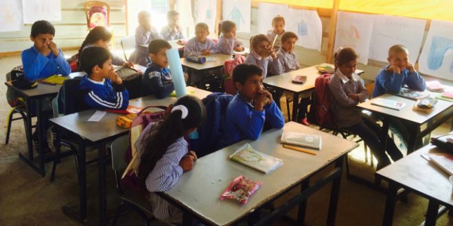 Nu sker undervisningen i byns samlingshus samlingslokal som är ett stort tält av plast. Vid vårt besök pågår lektion i arabiska för 16 andraklassare, hälften av dem är flickor. Alla räcker ivrigt upp händerna och när någon går fram till svarta tavlan och svarar rätt applåderar klasskamraterna.