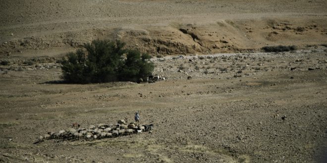 Today the shepherds wanted to set out at dawn. In summer, here on the outskirts of Jericho, by 9 or 9:30 in the morning it’s already over 38 degrees (100 Fahrenheit)—too hot even for goats. So we leave Jerusalem at first light, and by 6:30 we find Mhammad deep in the desert, close to the fenced-off date-palm grove of the settler Omer, who calls all the shots. Mhammad greets us happily; he’s in a good mood; so far things are quiet. “Soldiers? Have you seen any soldiers?” he asks. “Not yet,” we say.