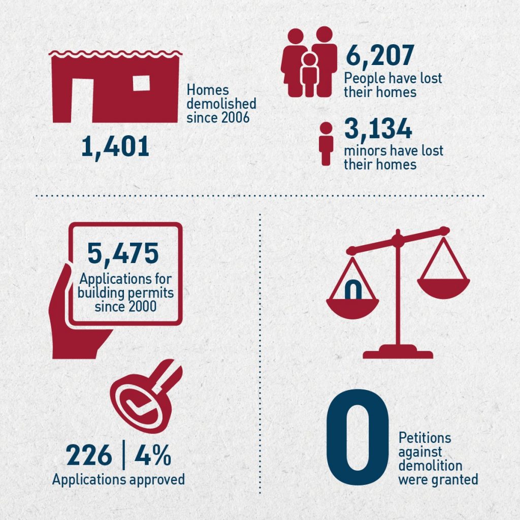 - Applications for building permits: According to Civil Administration figures, from January 2000 to mid-2016, Palestinians filed 5,475 applications for building permits. Only 226 (about 4%) were granted.