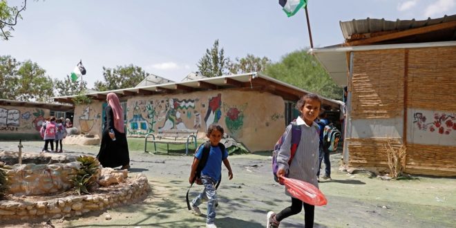 Palestinian Bedouin students walk in the courtyard of their primary school in the village of Khan al-Ahmar in the Israeli-occupied West Bank on September 6, 2018. Photo AFP