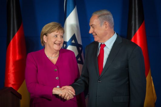 “Our visit has nothing to do with this,” Merkel added. “One can disagree on it, about the settlement policy, and I definitely have some critical remarks to make because I believe in the two-state solution, but that is not relevant here. We are two democracies and we can exchange different political opinions, also with the prime minister.”