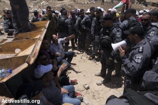 Palestinian, foreign, and Israeli activists try to block an Israeli bulldozer preparing for the demolition of Khan al-Ahmar, July 4, 2018. (Oren Ziv/Activestills.org)