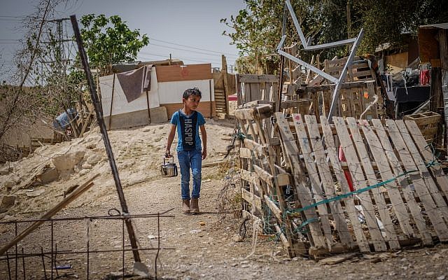 boy walks through the Bedouin village of Khan al-Ahmar, near the Jerusalem-Dead Sea highway, on April 13, 2018. (Yaniv Nadav/ Flash90)