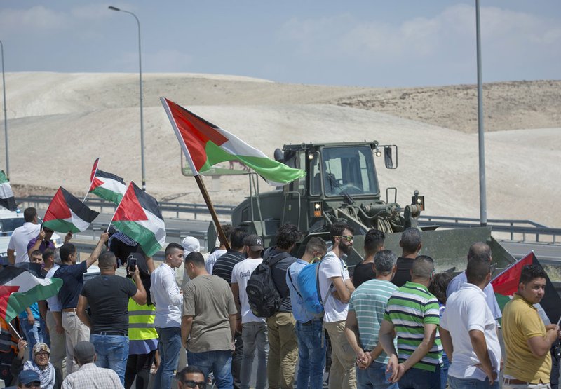 Israeli army bulldozer passes by protesters. (AP Photo/Nasser Nasser)