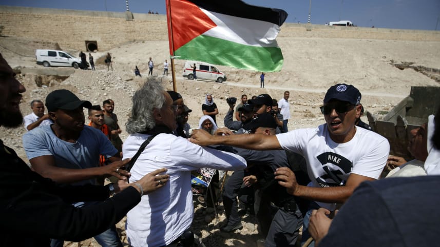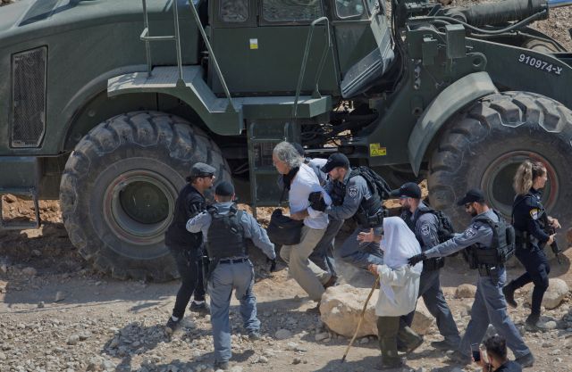 Israeli border police arrest French-American law professor and other protesters and activists blocking Israeli army bulldozer operating at the West Bank Bedouin community of Khan al-Ahmar, September 1Credit: Nasser Nasser/AP