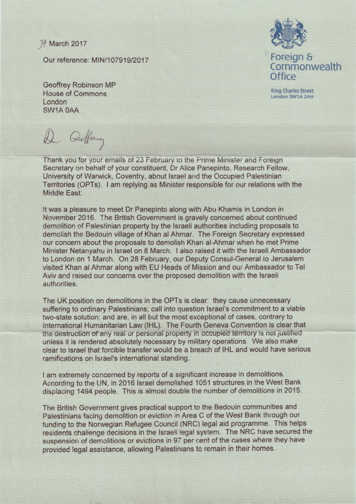 A letter responding to MP Geoffrey Robinson’s questions about Al Khan al Ahmar, from Minister Tobias Ellwood, following a meeting with the minister between Eid abu Khamis Jahalin, Dr. Alice Panepinto (of Queens Belfast), Chris Gunness (UNRWA) and Angela Godfrey-Goldstein of Jahalin Solidarity.