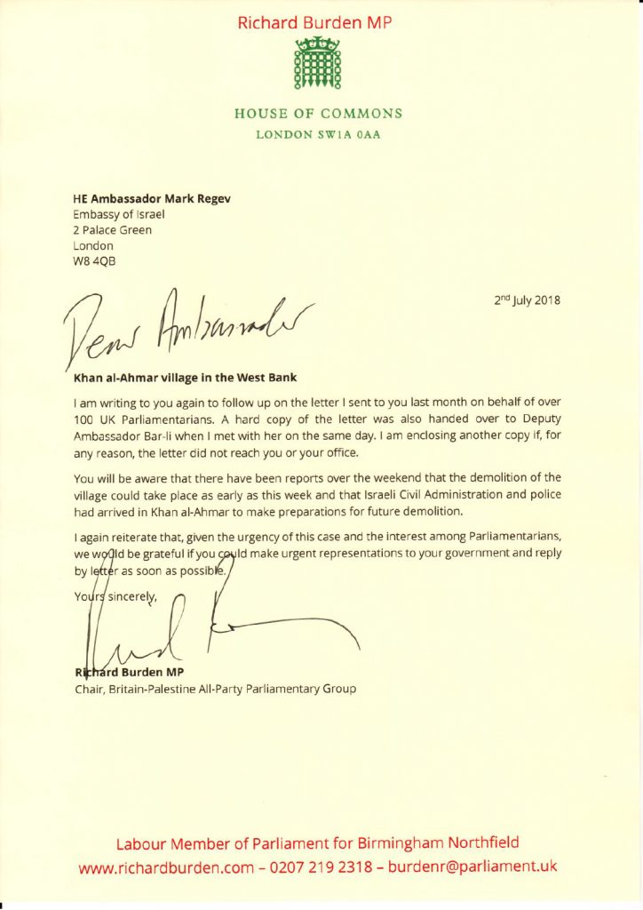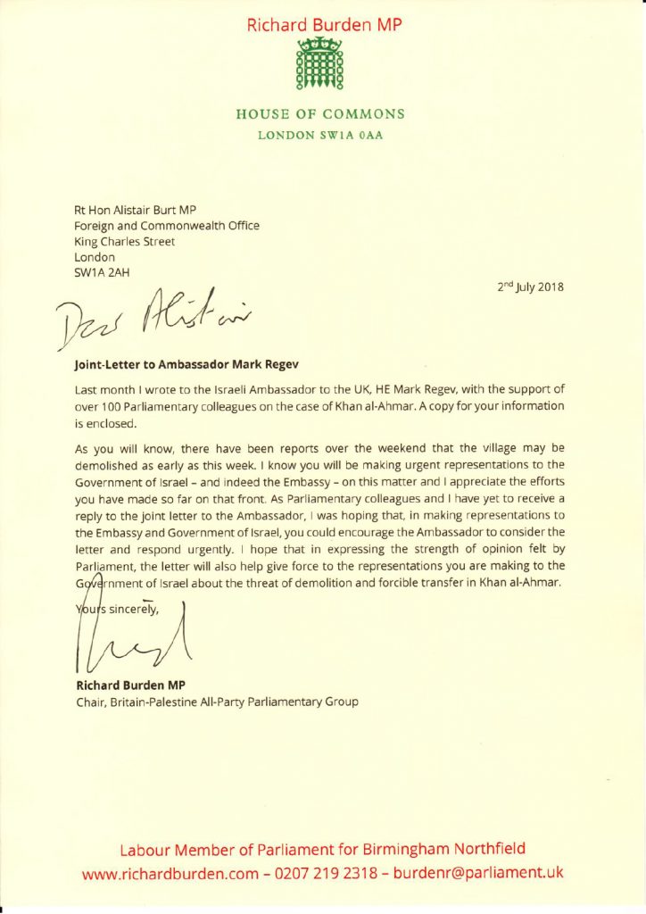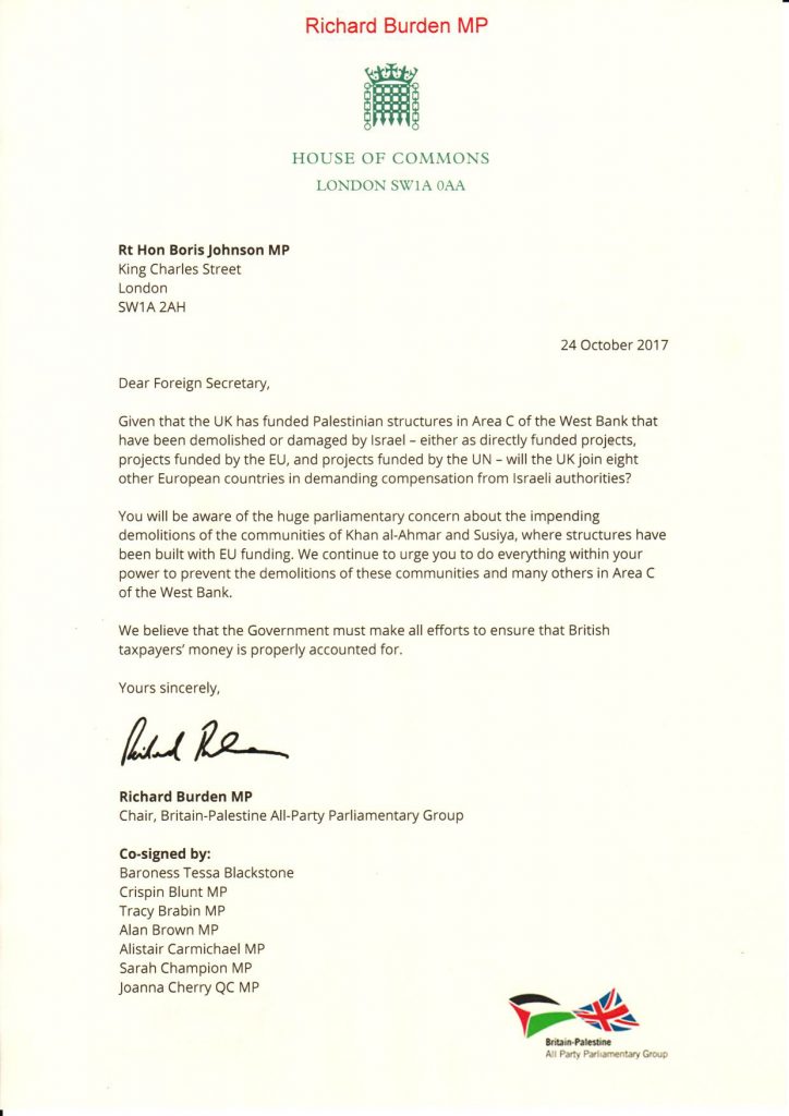 A letter from MP Richard Burden, co-signed by a group of MPs to the UK Foreign Secretary, Boris Johnson, with follow-up questions (of Jahalin Solidarity and CAABU) as to compensation for demolished humanitarian structures provided to the Jahalin in Jerusalem Periphery.