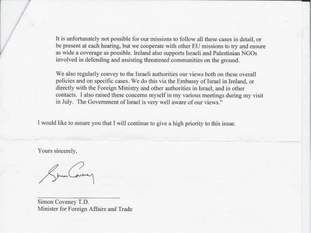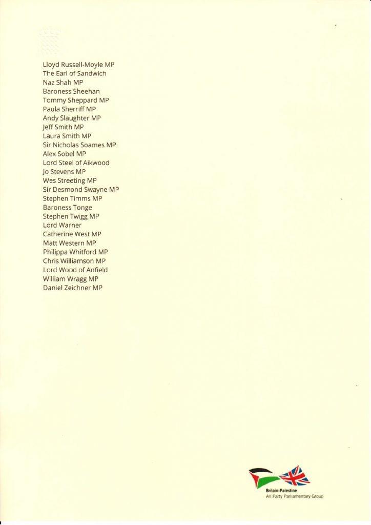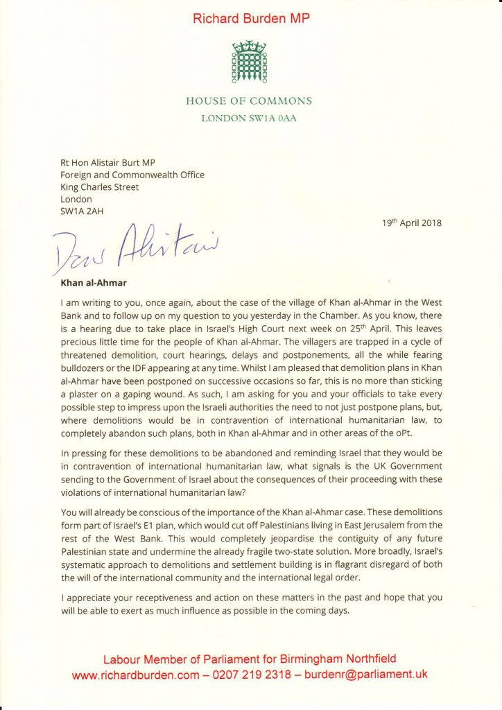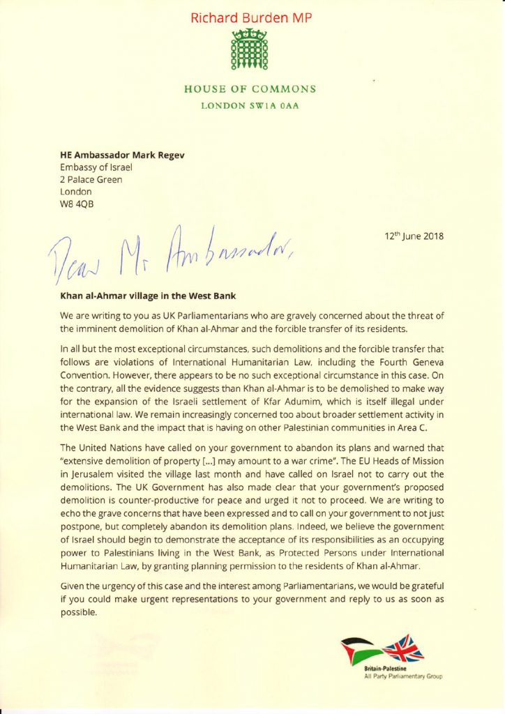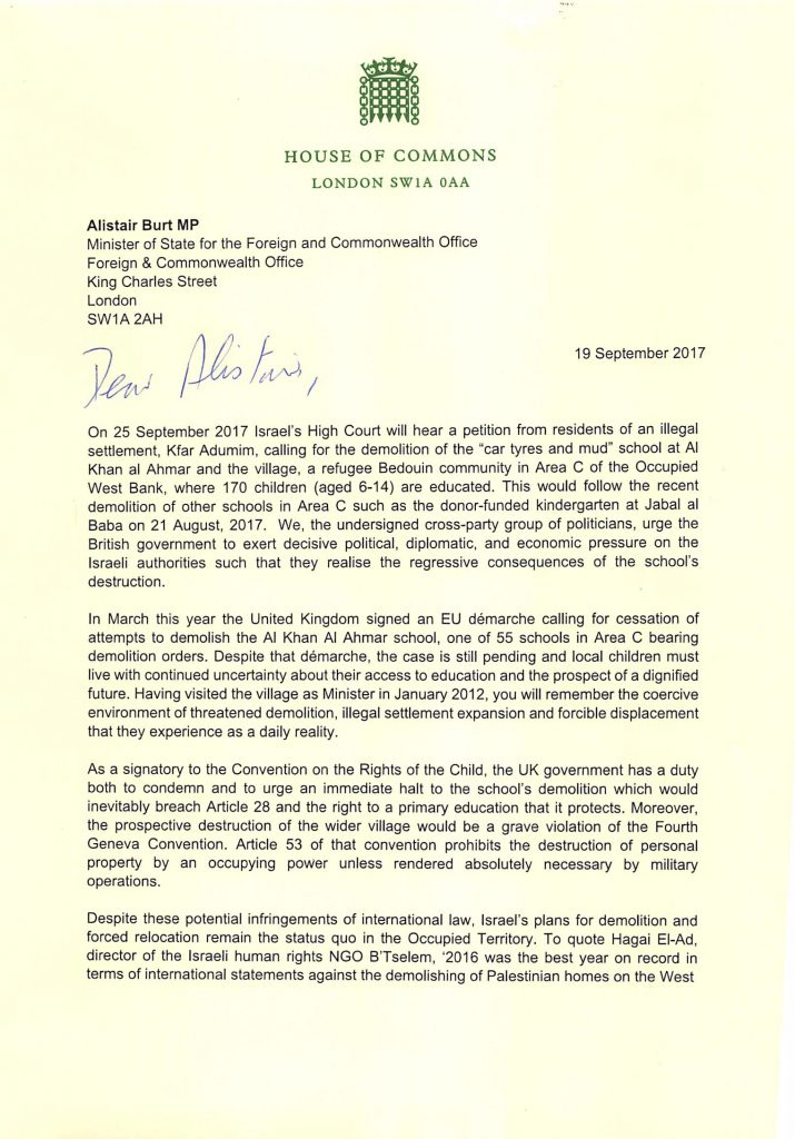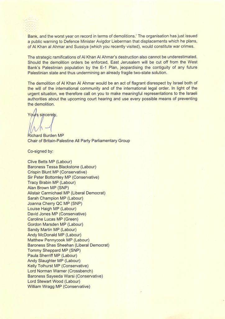 A letter (authored by Angela Godfrey-Goldstein of Jahalin Solidarity) signed by a cross-party group of 26 British members of Parliament, addressed to Minister for the Middle East Alistair Burt.