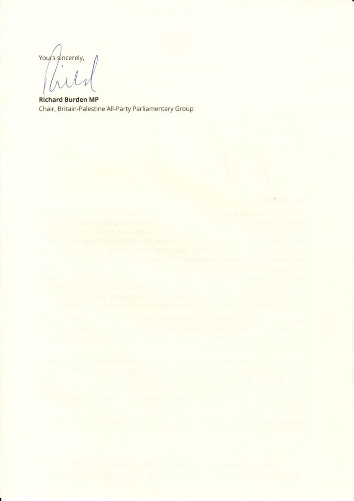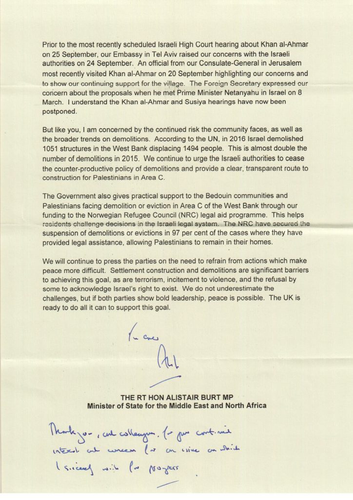 Response from Minister Alistair Burt to MP Richard Burden (Chair of the Britain-Palestine All Party Parliamentary Group) , as to the September 2017 letter.