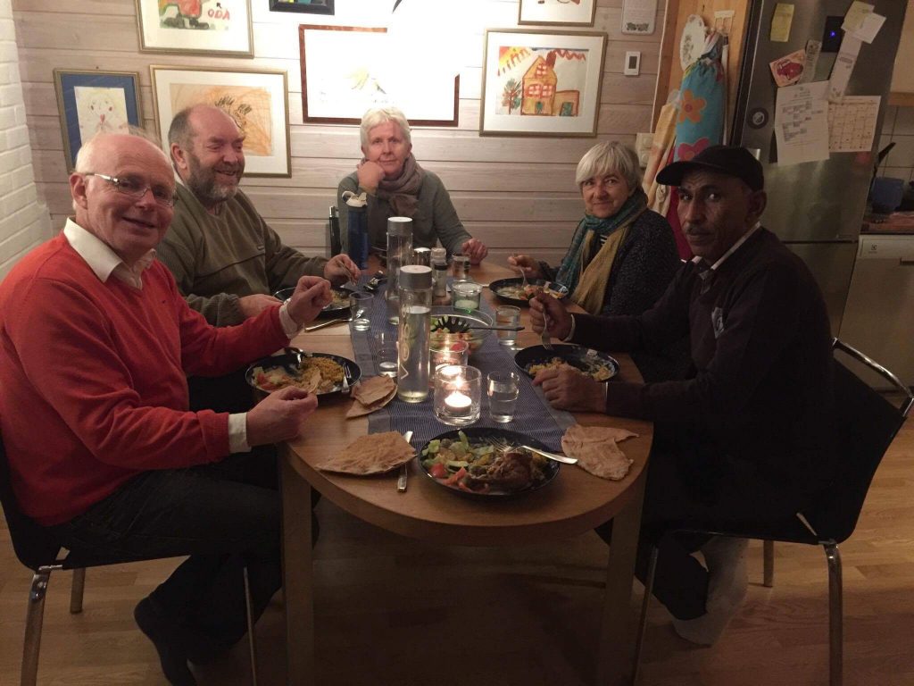 Godfrey-Goldstein and Eid abu Khamis in Hamar, Norway with Norwegian activists of The Palestine Solidarity Committee Hedmark, including Bernt Wold (left in red), and our host: Dagfinn Nyborg.