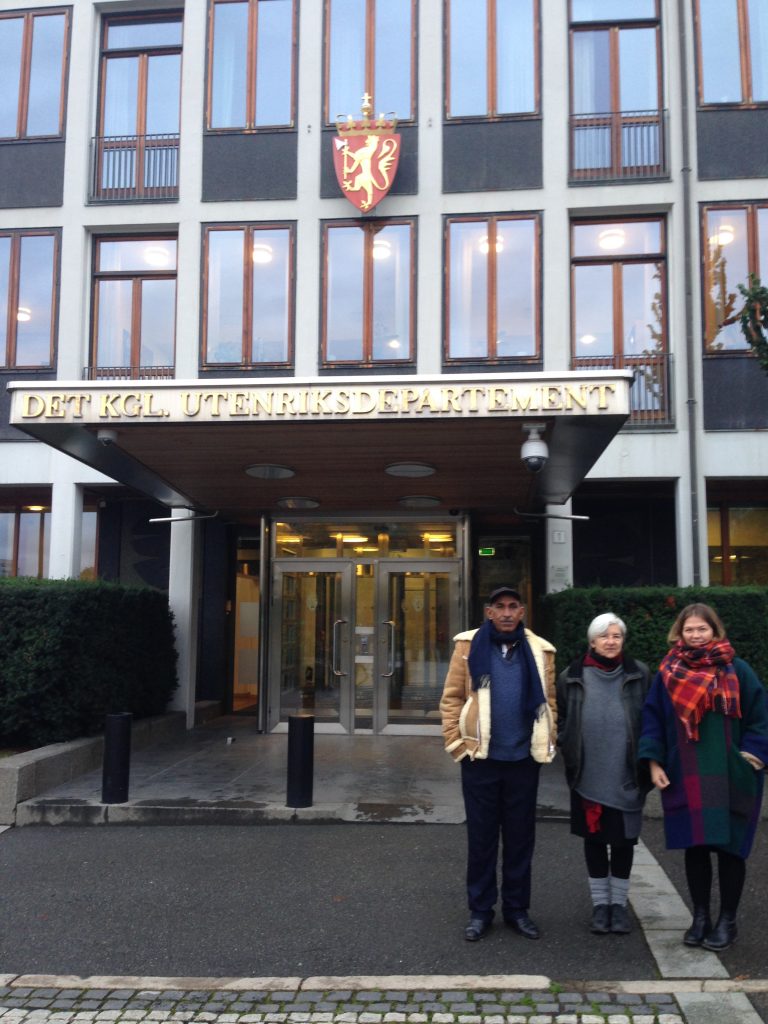 (left to right): Eid abu Khamis, Angela Godfrey-Goldstein and Kathrine Jensen of Norwegian Palestine Solidarity outside the Norwegian Foreign Ministry in Oslo, October 2017