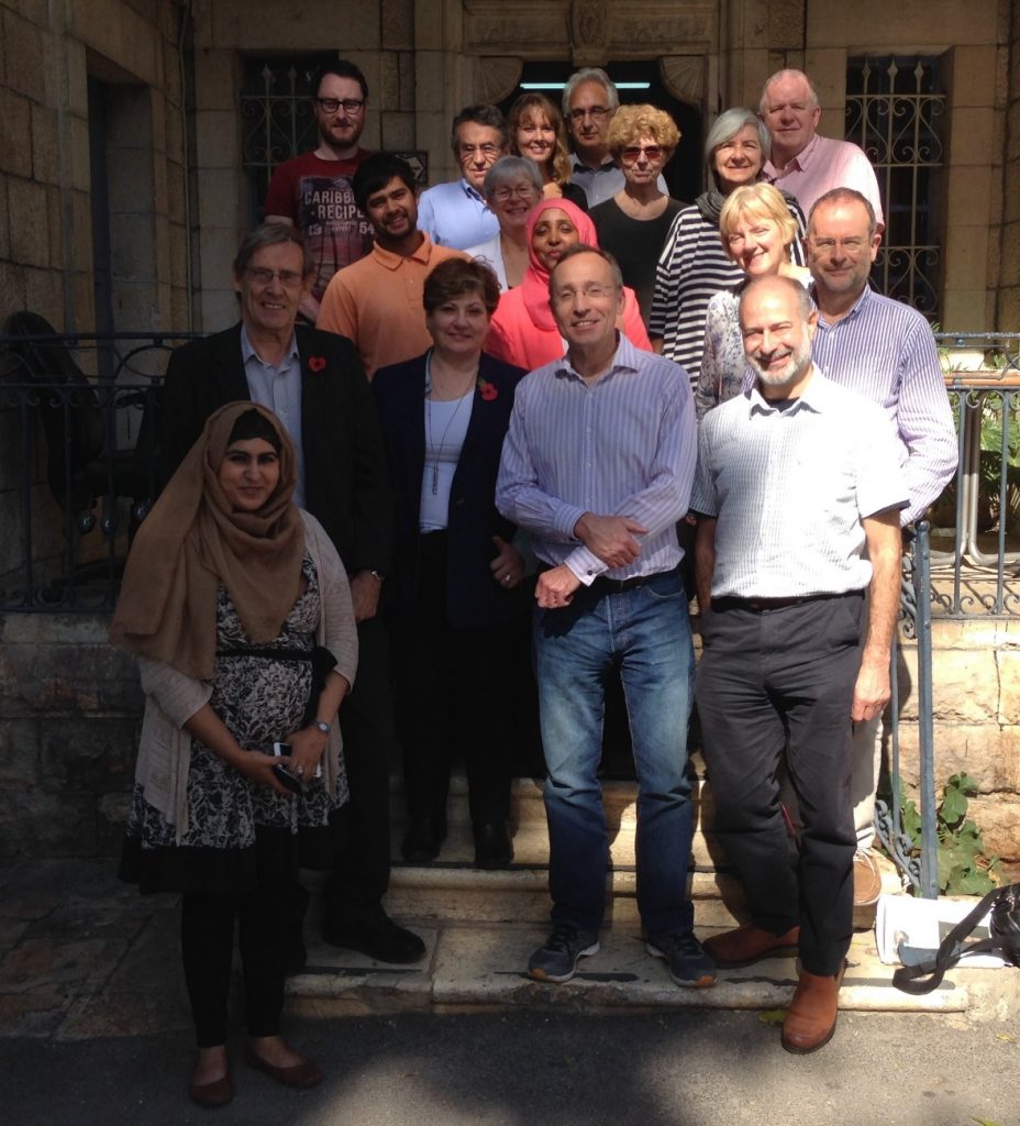 British Members of Parliament (Shadow Cabinet members) from the Labour Party: Emily Thornberry (Shadow Foreign Secretary), Andy Slaughter (Shadow Minister for Housing, Fabian Hamilton (Shadow Minister for Peace & Disarmament), together with Jahalin Solidarity’s co-director Angela Godfrey-Goldstein and Martin Linton (ex-MP and director of Travel2Palestine and Labour2Palestine), plus a group including Paul Blomfield MP and Linda McAvon MEP, outside the UN after an OCHA briefing.