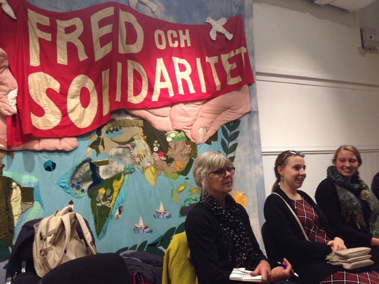 Jahalin Solidarity on tour in Sweden, at Gothenborg, meeting with Swedish activists. In the photo (centre) Dr. Alice Panepinto of Queens Belfast, who was with Jahalin Solidarity’s co-director Godfrey-Goldstein and Eid abu Khamis of Al Khan al Ahmar for the week in Sweden on tour in Gothenborg, Uppsala and Stockholm.
